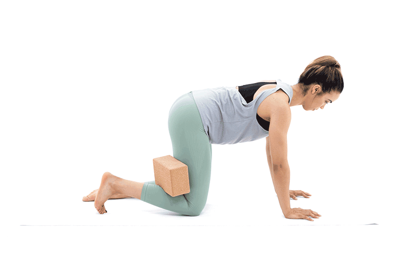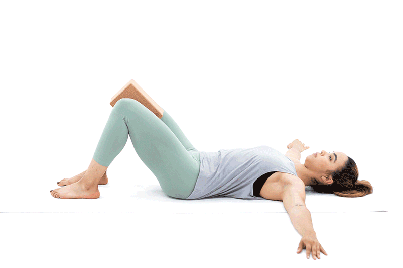◆ 双腿屈膝,大腿内侧夹瑜伽砖