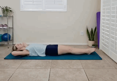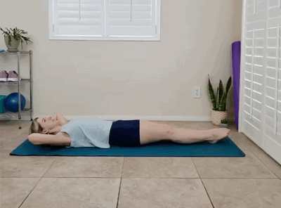 ◆ 仰卧于地,双腿屈膝向右侧转,直至右腿贴住地面;