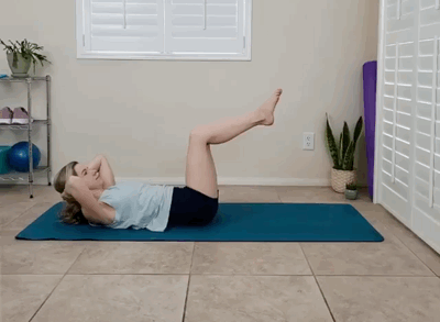 ◆ 呼气,腹部收紧,卷腹向上,抬右腿向上伸直;